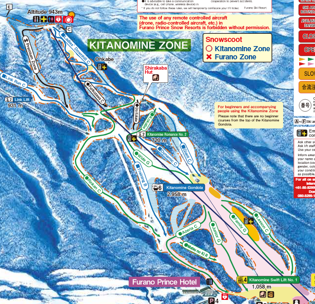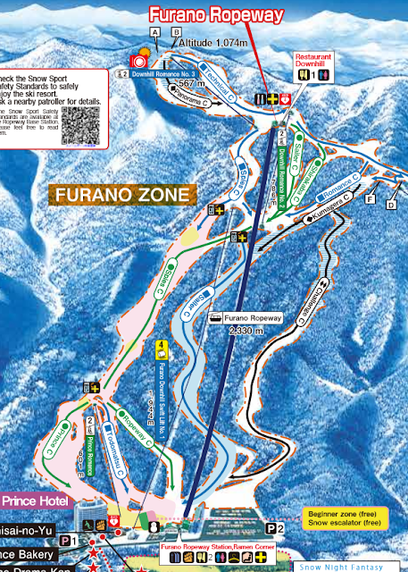 簡單來說,富良野滑雪場分了兩邊,一邊是北之峰(Kitanomine Zone)(舊王子酒店也在這邊),一邊是新王子酒店(Furano Zone),兩者相差了大概5~10分鐘車程(其實很近但要繞路)。